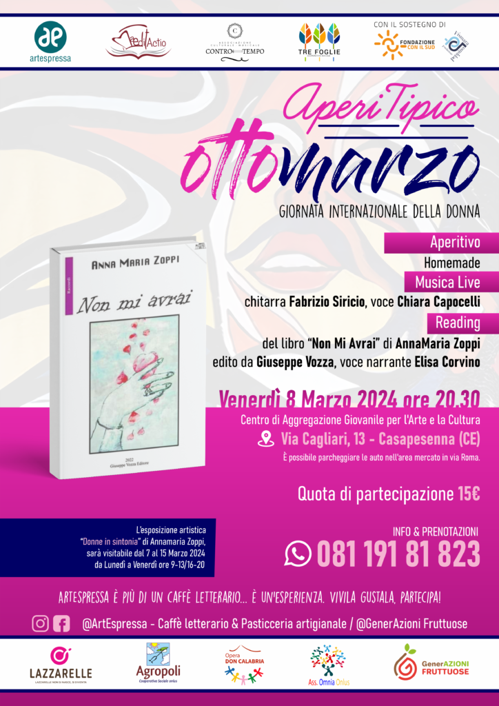 Venerdì 8 marzo ore 20.30 ci sarà l’AperiTipico, con aperitivo preparato nel laboratorio della Cooperativa, reading del libro “Non Mi Avrai” di Anna Maria Zoppi e musica live.