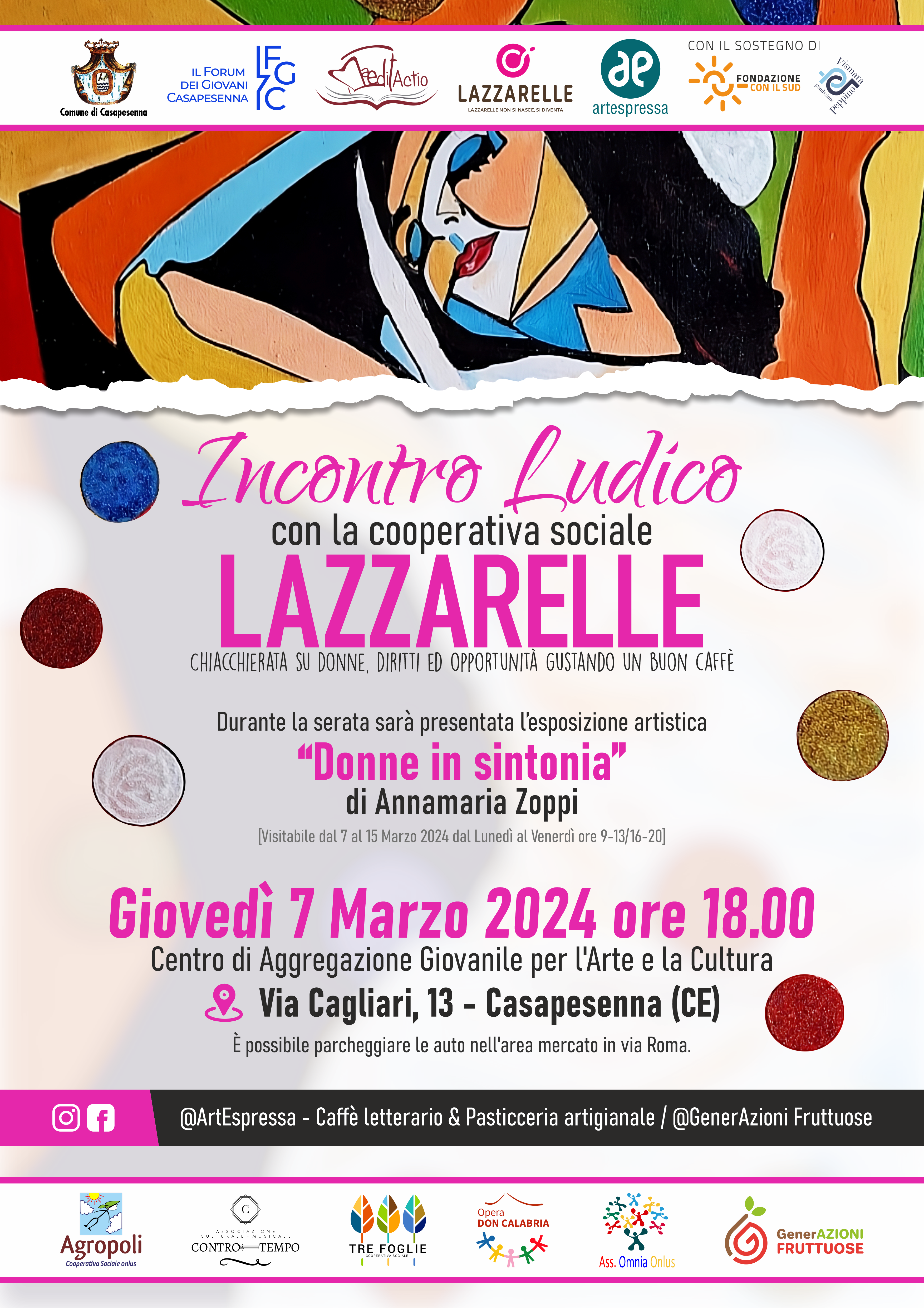 Giovedì 7 marzo ore 18.00, a Casapesenna, in via Cagliari dove ha sede la Cooperativa, si terrà un incontro ludico tenuto dalle operatrici della cooperativa sociale Lazzarelle; una chiacchierata su donne, diritti ed opportunità gustando un buon caffè. Durante il pomeriggio sarà anche presentata la mostra “Donne in sintonia” di Anna Maria Zoppi, che rimarrà esposta dal 7 marzo al 15 marzo.