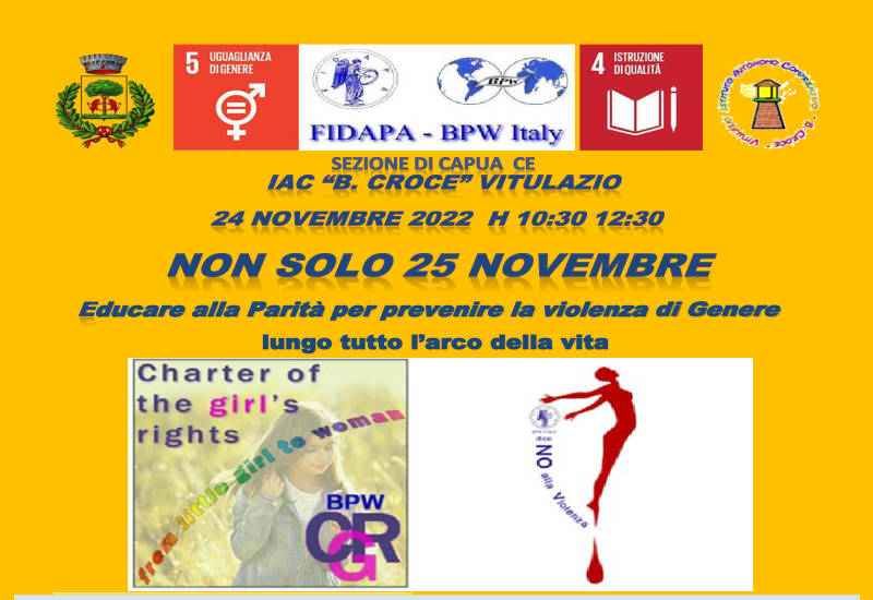 Il 24 novembre, con inizio alle ore 10.30, presso l’IAC Benedetto Croce di Vitulazio si terrà il convegno “Non solo 25 Novembre”- Educare alla parità per prevenire la violenza di genere lungo tutto l’arco della vita”, una bella iniziativa organizzata dalla FIDAPA, sezione di Capua.