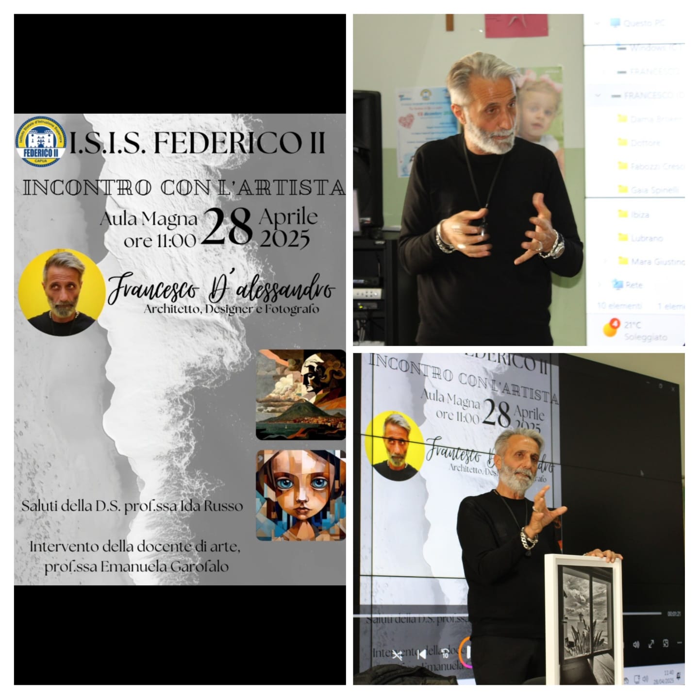 Questa mattina infatti gli studenti, in primis quelli dell’indirizzo di Architettura e Ambiente del Liceo Artistico e dell’indirizzo di Grafica e Comunicazione, hanno incontrato l’architetto Francesco D’Alessandro, noto artista casertano, originario di Capua – figlio della sig.ra Camilla Vavuso, per molti anni titolare dell’omonimo negozio di arredamento (ndr) – che combina molteplici passioni, dalla fotografia al design alla pittura.