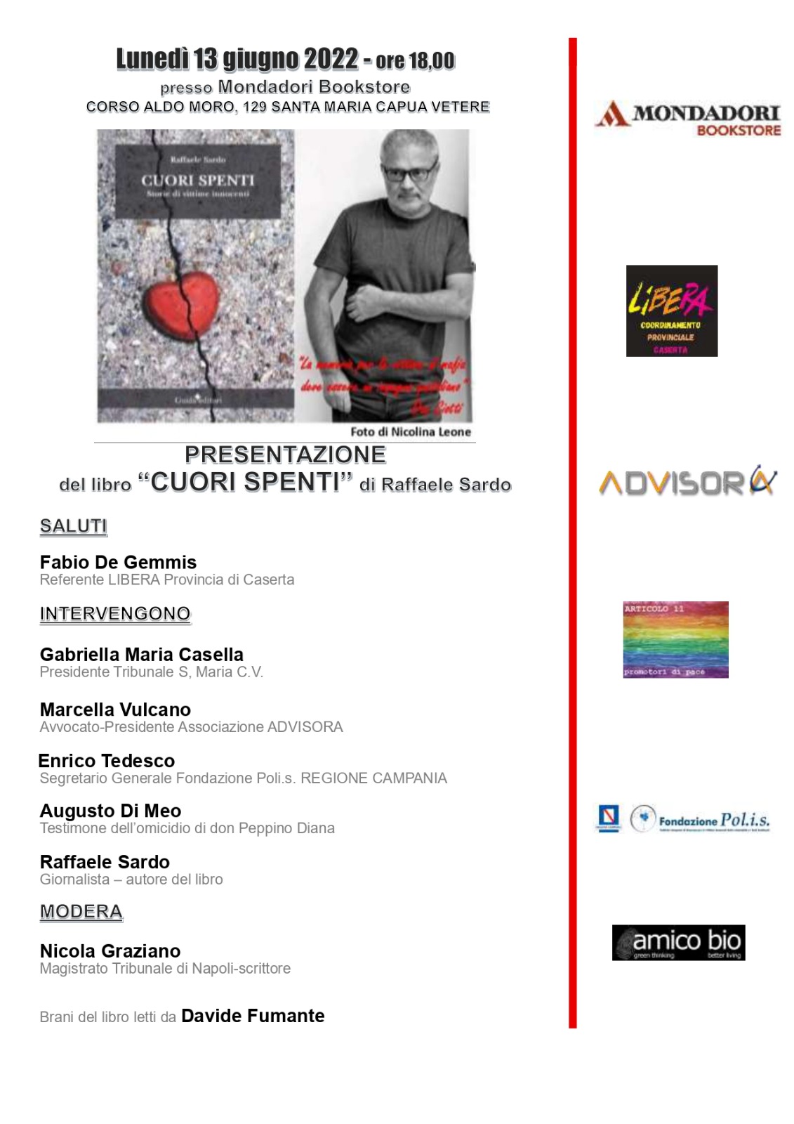 Alla presentazione del libro, dopo i saluti di Fabio De Gemmis Referente LIBERA Provincia di Caserta, interverranno: Gabriella Maria Casella Presidente Tribunale S. Maria C.V., Marcella Vulcano, Avvocato Presidente Associazione ADVISORA, Enrico Tedesco Segretario Fondazione Poli.s. REGIONE CAMPANIA, Augusto Di Meo, Testimone dell’omicidio di don Peppe Diana e l’autore, Raffaele Sardo. Coordina l’incontro Nicola Graziano, Magistrato del tribunale di Napoli e scrittore. La lettura dei brani è a cura di Davide Fumante.