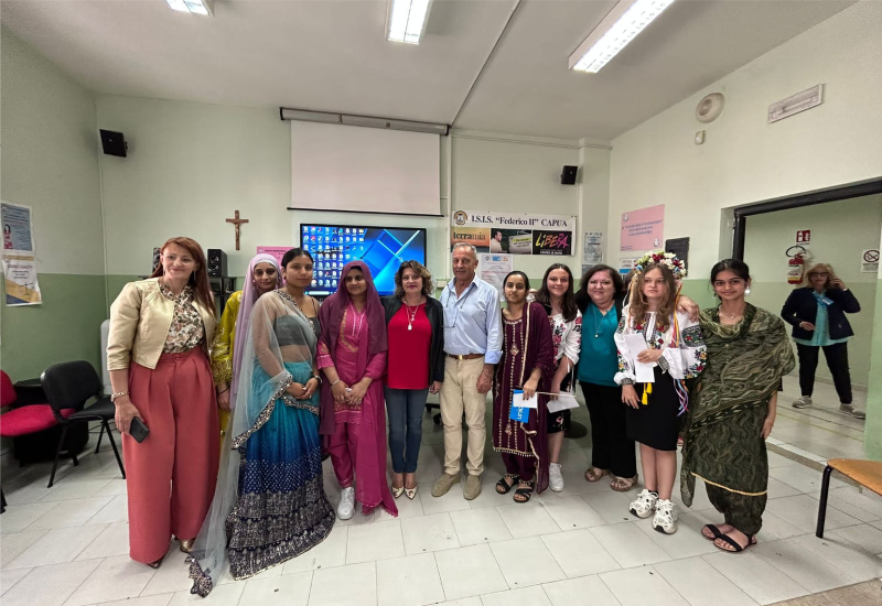 Incisivo è stato l’intervento del dottor Savino Compagnone, commoventi i messaggi in lingua di Blessin, Aminati e Matilda, ospiti della cooperativa città Irene, tradotti dalla dottoressa Teresa di grazia, mediatrice interculturale. Sono altresì interventi Agata Catone, responsabile “Casa della Divina Misericordia “ e Mena Mezzullo, comitato provinciale UNICEF Caserta. Ad arricchire l’evento la presenza di alunne straniere in abiti tipici originarie del Pakistan, Ucraina e Polonia frequentanti il nostro istituto.